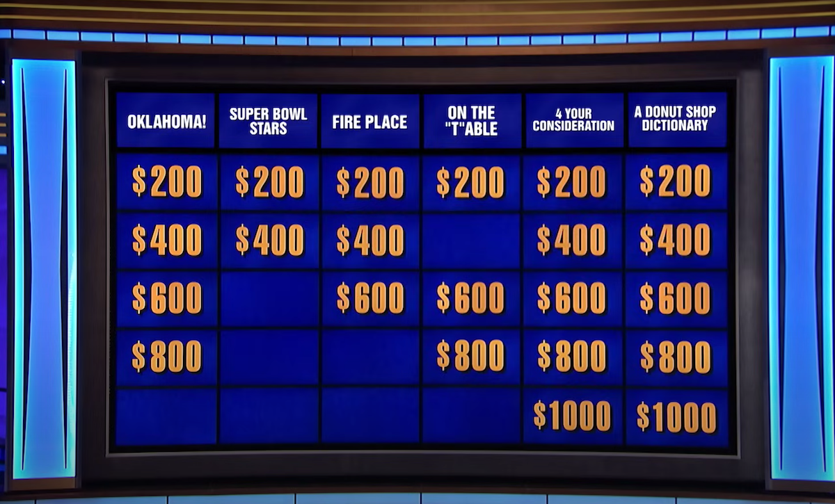 Die US -Sonne berichtet, dass während einer Oktober -Episode von Oktober In der Gefahr! , Whitcomb Foss sagte das Ein weiterer Optionsproduzenten erforschte sich Ich habe den Kategoriennamen zusammen mit dem Hinweis für die Zuschauer zu Hause auf den Bildschirm gebracht, nur sie fanden heraus, dass es "nicht genug Raum" gibt. Sie erklärte: "Als Sie eine dieser langen Kategorien und den Text des Hinweises erhalten, passte es nicht wirklich, dass es so passen."