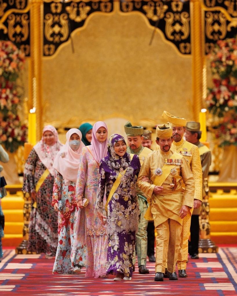 Eine 10-tägige Hochzeitsfeier begann mit einer islamischen Hochzeitszeremonie, die nur für Männer bestimmt war. Sie ging in eine luxuriöse Moschee mit einer goldenen Kuppel in der Hauptstadt von Brunei Bandar-Seri-Bugavan. Später fand ein Ritus des Pulvers statt, bei dem enge Familienmitglieder eine Pulverpaste in die Hände der Braut und der zukünftigen Braut auftraten.