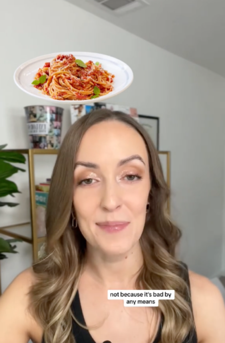 "Nummer sechs auf dieser Liste ist Pasta, nicht weil es auf keinen Fall schlecht ist, aber es ist wirklich leicht zu übertreffen", betont sie in einem Follow-up Tiktok Video . "Wenn Sie also das nächste Mal Ihre Nudeln kochen, müssen Sie vorab messen, um zu sehen, wie diese 2-Unzen-Portion tatsächlich aussieht."