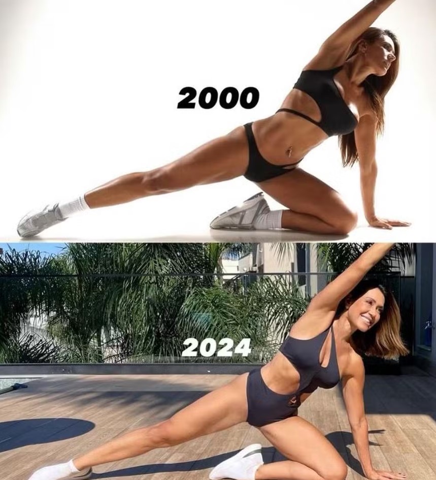 Auf dem ersten Bild erscheint sie mit einem blauen Oberteil und zwei Hanteln, die in die Kamera posieren und ein offenes Lächeln stempeln. In der zweiten, vor 26 Jahren eingenommenen, lächelt sie ebenfalls mit einem gestreiften Bikini und einer blauen Steinkette.