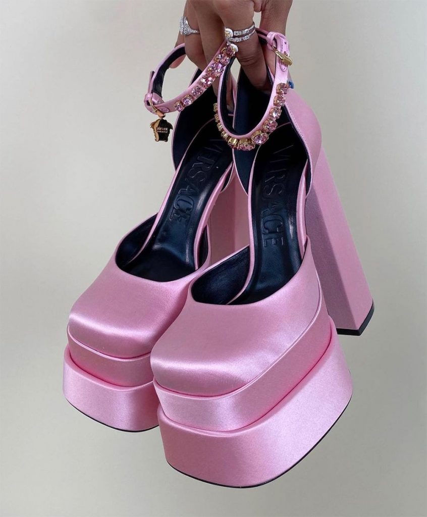 Diese Schuhe begannen ihren siegreichen Kurs Ende 2020, und bereits im Jahr 2021 fegten Handelsplattformen Sorten dieses Modellmodells. Interessanterweise, je größer die Größe sie schien und desto seltsamer das Design, desto mehr Fashionistas mochten es. Der Gipfel für Schuhe mit einem quadratischen Umhang war die Ausstellung des Modehaus Versace Herbst/Winter 2021, als Donatella Versace ihnen einen hellen Atlas und High Heels hinzufügte.