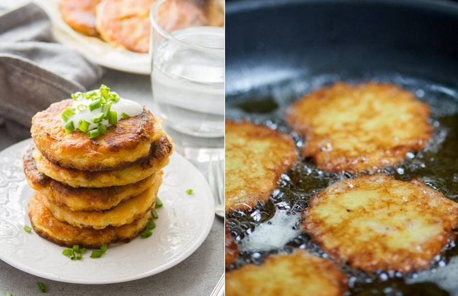Sie können das wahre Vergnügen am Essen haben, indem Sie Kartoffelpfannkuchen probieren. Sie werden normalerweise mit saurer Sahne oder Pilzsauce serviert.