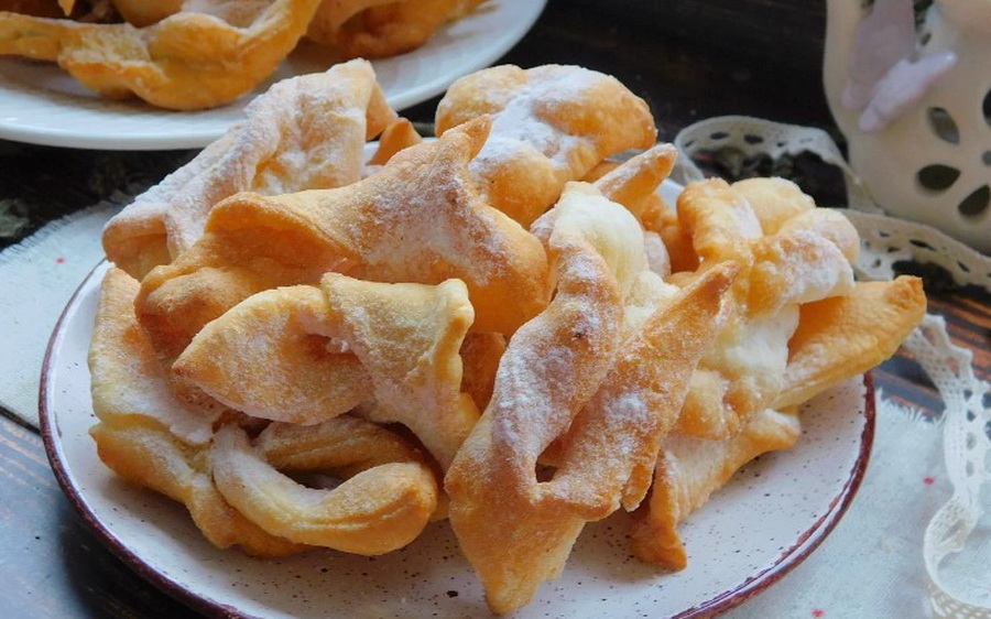 Als Dessert sollten wir Verguns schmecken. Dies sind köstliche frische Teigprodukte, die normalerweise Alkohol hinzugefügt werden. Der Teig ist dünn mit dünnen Platten gerollt und in Streifen geschnitten. Dann sind sie im Smalle miteinander verflochten und gebraten. Heißvergee platzen vor süßem Pulver.