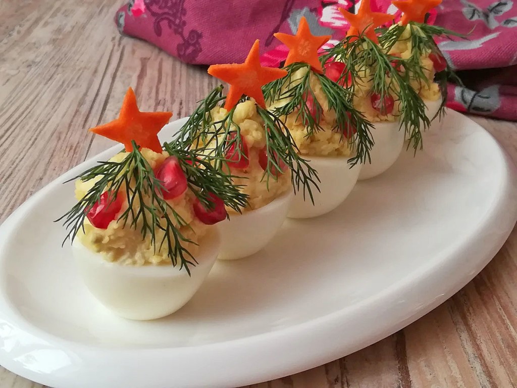 Das Gericht, das seit dem 16. Jahrhundert zu uns kam, als nur Adlige gegessen werden konnten. Auf den ukrainischen Neujahrstabellen war es aufgrund seiner Einfachheit und Kompaktheit in Form eines Snacks Wurzeln. Die einfachste und standardmäßige Variation - Eier mit erstauntem Fisch in Dosen (Sardinen oder Spratten) gefüllt, werden aber auch mit Pilzen, Leber, würzigem Käse, Krabbenstöcken, Hummus und mehr zubereitet.