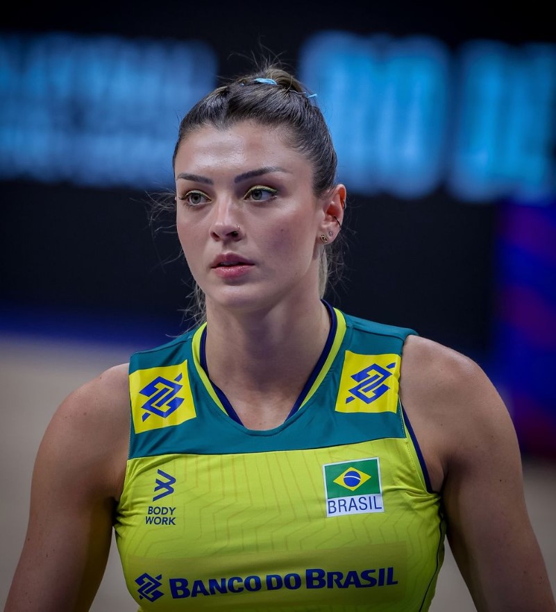 Olympische Medaillengewinnerin in Tokio (2020), brasilianischer Volleyballspieler Rosamaria Montibeller rockt den Platz in den gegenüberliegenden und Tipppositionen. Das aktuelle Shirt 7 des brasilianischen Teams sucht sein drittes olympisches Gold unter dem Kommando von Trainer Zé Roberto Guimarães.