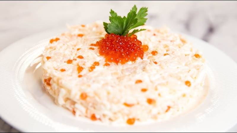 Sie können das übliche Menü mit einem anderen Originalsalat diversifizieren. Um es vorzubereiten, werden die folgenden Zutaten benötigt: 500 g Hühnfilet, Maisglas, 4 Eier, 500 g eingelegte Pilze und Mayonnaise. Schneiden Sie Hühnchen, Pilze und Eier mit Würfel. Mit Mais mischen. Wir würzen den Salat mit Mayonnaise und Salz zum Geschmack. Darüber dekorieren wir mit roten Kaviar- und Petersilienblättern.
