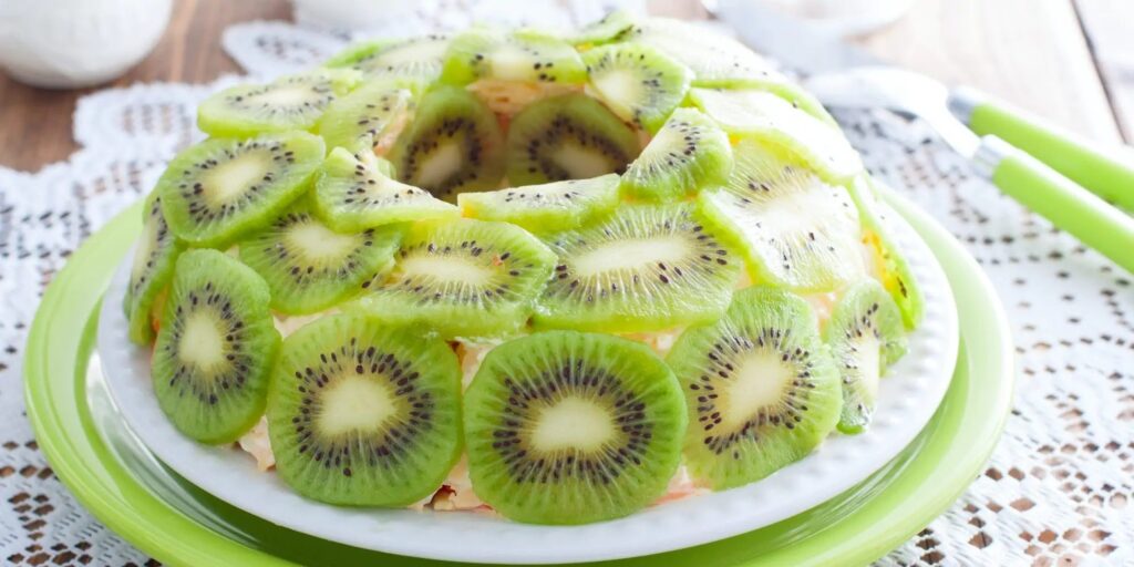 Dies ist eine der harmonischsten Kombinationen für Salat: Kiwi betont den Geschmack von Hühnchenfilet, gekochten Eiern und Käse vor. Ein solches Gericht ist sowohl im täglichen Menü als auch auf dem festlichen Tisch angemessen.