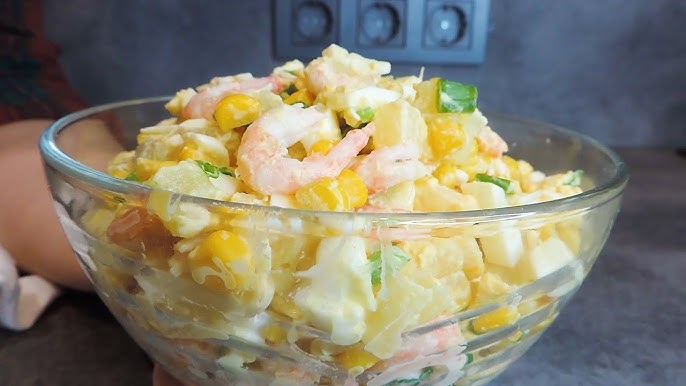 Das Geheimnis des Kochens ist einfach. Mischen Sie 150 g fertige Garnelen, eine Dose Mais, 3 Eier und 100 g Dosenananas. Seien Sie den Salat mit Mayonnaise. Salz- und Pfeffergeschmack.
