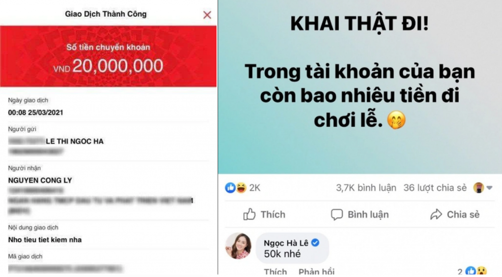 Vor kurzem hat Cong Lys Frau Menschen wegen ihres Kontos auf ihrem Konto verwirrt. Insbesondere hat das "Team Crossing" den 8 -fachen weiblichen Reporter erwischt, der einen Kommentar mit dem rechten "50K" hinterließ, um die Zeremonie unter 1 Artikel auf der Community -Seite zu verlassen. Der kleine Informationsfluss von NGOC HA war überrascht, weil sie vor einem Jahr das Taschengeld öffentlich auf ihren Ehemann von bis zu 20 Millionen überwies.
