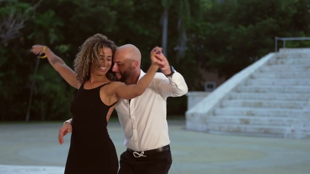 Angriffe und Deutschland sehen sich zu jeder Zeit mit einem verführerischen Gesicht und voller Lächeln aus. Das lockige Haar des Tänzers reißt sein Gesicht und rahmt seinen Ausdruck, der zwischen sinnlich und lustig ist. Beide scheinen zu tanzen und dominieren die Umgebung der Präsentation mit Schritten, Kurven und breiten Bewegungen der Arme und Hüften zu dominieren - die charakteristischen Elemente des Bachata -Stils sind.