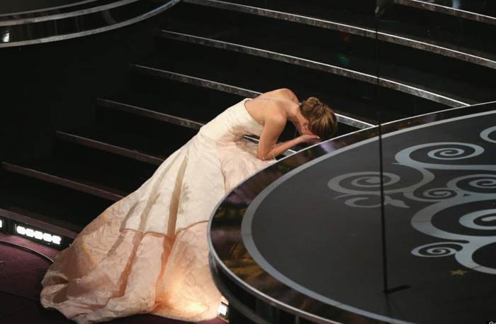 Während Lawrence die Leiter aufstieg, um während der Academy Awards 2013 die beste Schauspielerin für ihre Rolle in dem Film "Silver Lennings Playbu" zu erhalten, fiel Lawrence direkt auf den Boden und machte dann ihr Bestes, bis sie steht.
