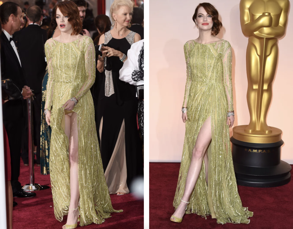 Emma Stone ist der Modewelt in den Oscars nicht fremd, aber ihr Look von 2015 war so voller Bewegung, dass sie sich nicht ganz bequem fühlte. Der Star des Films "Birdman" blendete das Publikum in einem grünen Kräuterkleid, das mit Perlen gestickt wurde, die von Elie Saab entworfen wurden und von den Nymphen des Meeres inspiriert zu sein schienen. Aber was ist mit diesem kühnen Schlitz, der den Oberschenkel erreicht? Er hatte sein eigenes Ziel. Während sich Stone auf dem roten Teppich bewegte, gaben Fotografen einen Blick auf ihre Unterwäsche - einen unerwünschten Nebeneffekt eines leichten und erfrischenden Kleides, ebenso wie wunderbar. Ist es eine Garderobe? Technisch ja ja. Ist es eine Katastrophe in der Modewelt? Natürlich nicht.