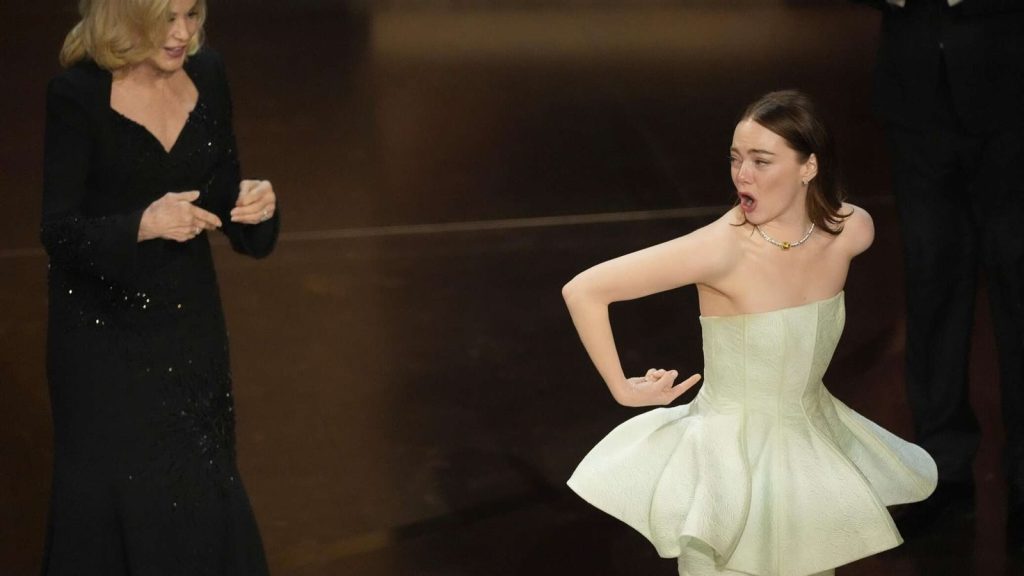Die berühmte amerikanische Schauspielerin Emma Stone sah sich einer sehr peinlichen Situation gegenüber, als sie aufstieg, um den "Oscar" -Preis für die beste Schauspielerinkategorie für ihre Rolle in dem Film "Poor Things", in dem ihr Kleid nur wenige Momente vor der Bühne aufstieg, um die Auszeichnung zu erhalten.