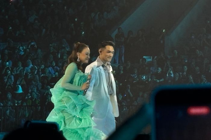 Plötzlich schrie das ganze Publikum sofort hysterisch! Die Schreie des Publikums fühlten sich in diesem Abschnitt am lautesten an. Rossa, die vor der Bühne gestanden hatte, näherte sich langsam Afgan, der in ihrem weißen Anzug schnippte. Sie hielten die Hände, starrten sich voller Bedeutung an und sangen das Lied bis zum Ende. Der Romantiker lässt das gesamte Publikum maximal Baper werden! Ohne Worte umarmten sich die beiden, als der Hydraulik sie auf die Bühne brachte. Dieser Moment ist im Hauptschein erfolgreich und lässt die Atmosphäre brechen!