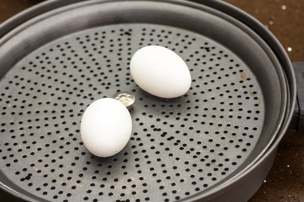 Die Eier werden auf dem Dampf zubereitet, indem sie eine Schüssel über dem Kochen legen und das Ei 10-12 Minuten kochen. Und wenn Sie das Eigelb bevorzugen, reduzieren Sie die Kochzeit auf 6 Minuten. Diese Methode ist völlig gesund.