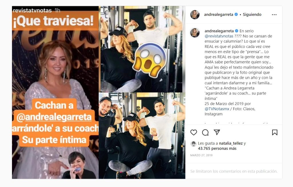 Im Jahr 2019 das mexikanische Magazin TVNotas Er veröffentlichte einige Fotos von Legarreta in einem Fitnessstudio, in dem er die intimen Teile eines Mannes sehen sollte, der sein damaliger Trainer war. Dies war ein Skandal, der die Moderatorin und die Schauspielerin dazu veranlasste, eine Klage gegen das Magazin einzurichten. Nach drei Jahren Urteilsvermögen stellte ein Gericht fest, dass die Fotos manipuliert worden waren, und befahl dem Verlag, Legarreta 2,5 Millionen mexikanische Pesos (ca. 130.000 US -Dollar) zur Entschädigung für moralische Schäden und „zur Veröffentlichung eines falschen Bildes zu veröffentlichen, um Schaden zu verursachen und mit offensichtlicher Gewalt geschlechtsspezifisch zu veröffentlichen“.
