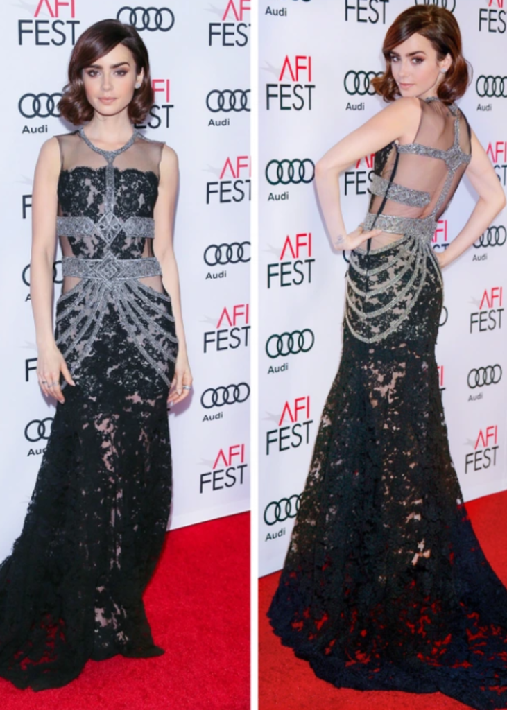 Zwischen Retro -Inspiration und dem zeitgenössischen Chic trägt Lily ein Kleid, das eine bemerkenswerte Spitze zurückbindet. Von hinten scheint es in eine empfindliche Papiergeschichte eingeschrieben zu sein.