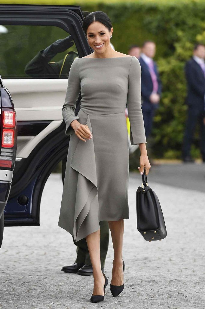 Während der Reise nach Emerald Isle trug Meghan ein graues Kleid, das von Roland Mouret ziemlich "traurig" wurde. Nicht nur die Farbe, der Stil des Kleides ist nicht ganz besonders. Außerdem entschied sie sich für einen drahtlosen BH und machte den Rock eng.