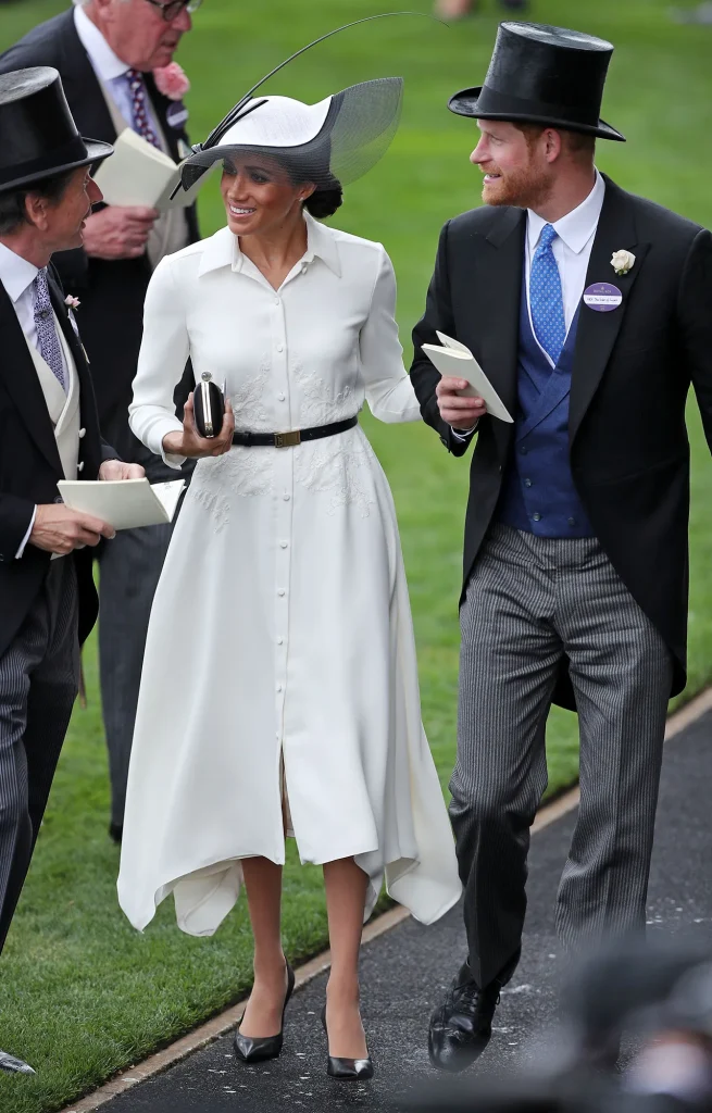 Beim Royal Ascot Horse Racing trug Meghan ein weißes Hemd mit Givenchy -Knopf, kombiniert mit einem schwarzen Gürtel. Dieser Stil ist im Vergleich zur Natur des Ereignisses ziemlich sanft und ein bisschen starr. In der Regel werden die Royal Ascot -Teilnehmer standardmäßig die schönsten Kostüme mit Pastellfarben, kräftigen Designs und Texturen oder auffälligen Materialien tragen.
