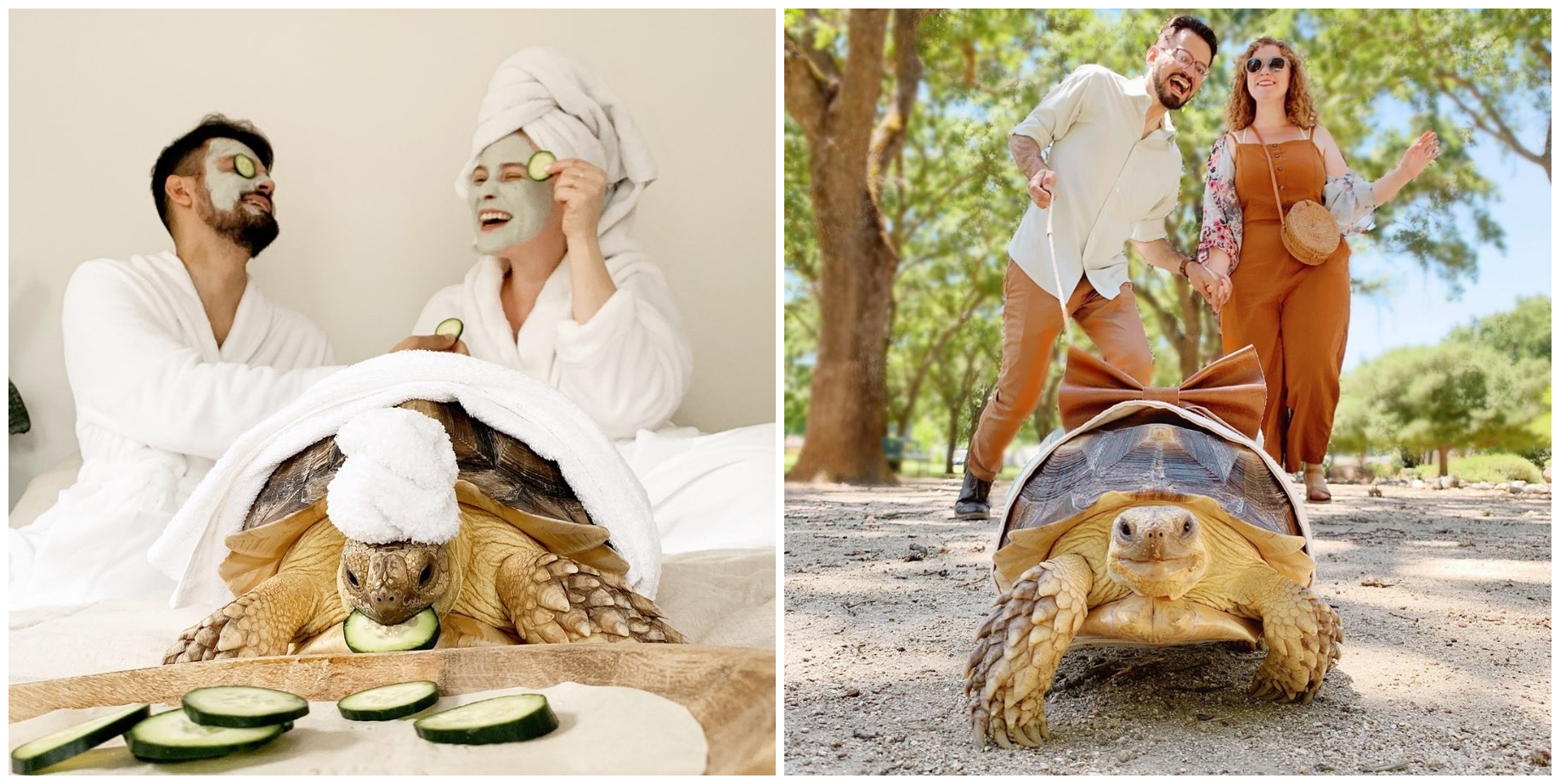 Einige Leute werden ihre Hunde oder Hauskatzen zur Unterhaltung auf Social Media kleiden. Der andere scheint sich zu verkleiden ... seine Schildkröte zu wählen.