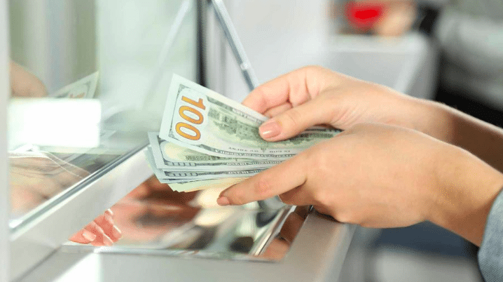 Der Mensch sieht in einem geheimnisvollen Umschlag, der von einem Fremden eintrat, und läuft aus der Bank, bevor es zu spät ist