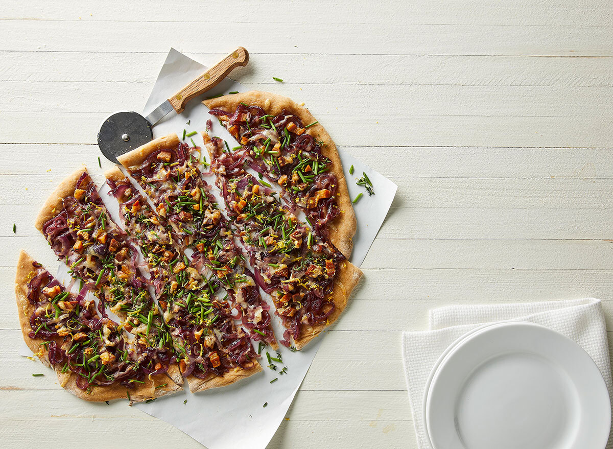 Ganzweizenpizza mit Gruyère, Pancetta und karamellisierten Zwiebeln