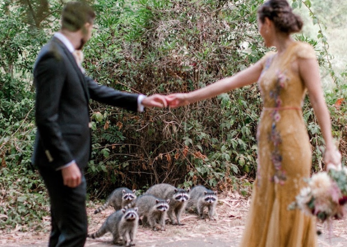 Waschbären photobombierte die Hochzeitsporträts dieses Paares und es war einfach magisch
