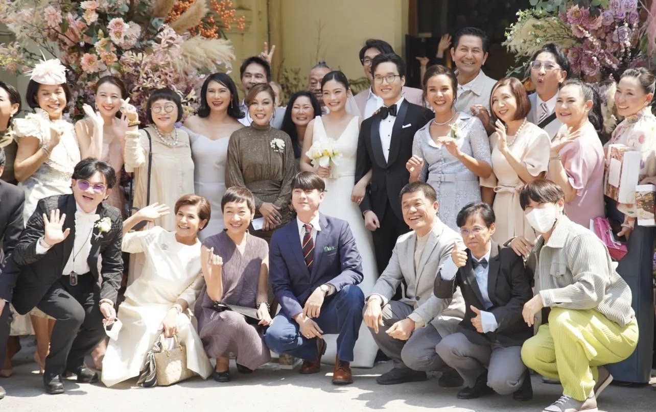 Warme Momente, beeindruckender, gutaussehender Bräutigam und wunderschöne Braut, Sohn und Tochter, berühmter Schauspieler. Und die große Version der thailändischen Unterhaltungsindustrie, Pad Thai, glücklich, gut, gut, und der Chanthanthakat, die beide Erben krümmt sind.