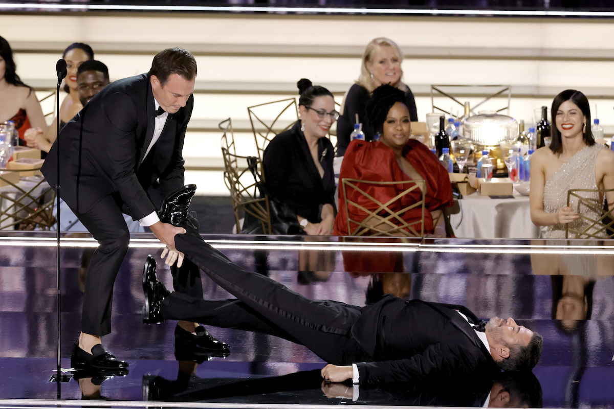 Kimmel steht vor, nachdem er bei der diesjährigen Show die Auszeichnung für das Comedy -Schreiben überreicht hat.