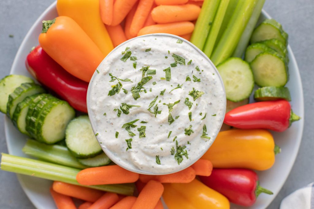 Cut the vegetables. Mash the cheese and mix with yogurt to create a thick dip. Divide the sauce into glasses and insert vegetables into them.