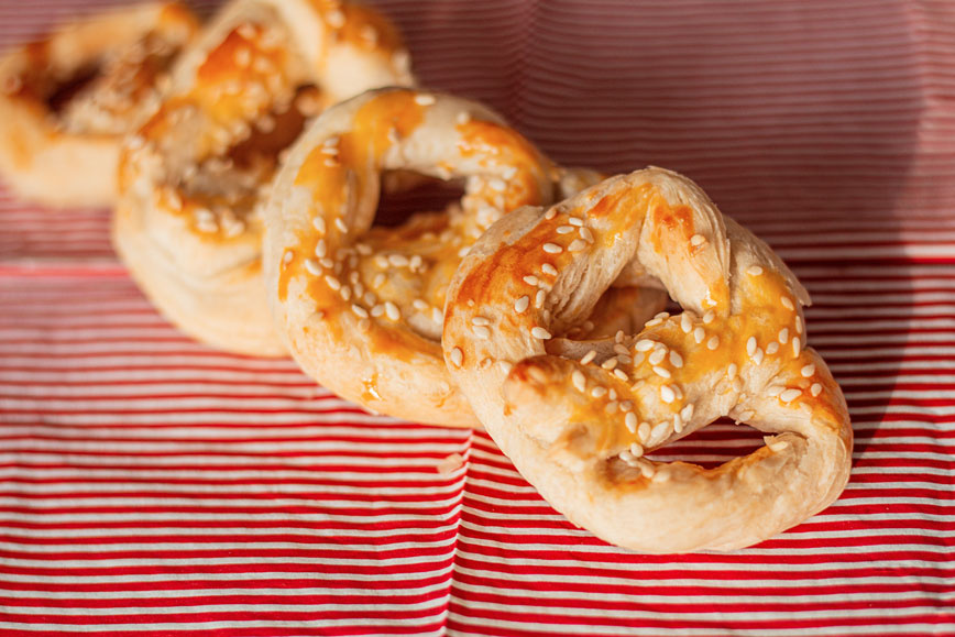 Roll the dough strips into mini pretzels, brush with yolk, sprinkle with sesame seeds and bake for 10–15 minutes at 200°C.