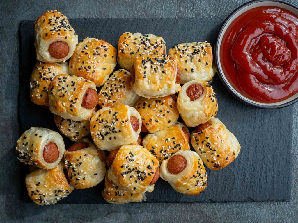 Thaw the dough and cut it into long ribbons. Wrap each sausage in dough, cut into small pieces and place on a baking sheet. Preheat the oven to 200°C and bake for 10–15 minutes until the dough is golden brown.