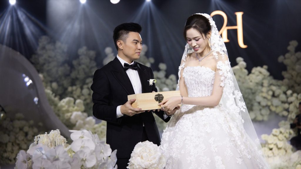 Pasangan ini melakukan ritual yang cukup unik yang disebut "Upacara Kotak Anggur" untuk mengekspresikan komitmen mereka terhadap cinta yang erat dan abadi yang akan menyatu seiring berjalannya waktu, seperti rasa anggur, semakin lama disimpan, semakin berharga jadinya. Oleh karena itu, mereka memasukkan botol anggur tersebut ke dalam kotak cinta dengan nama kedua mempelai.